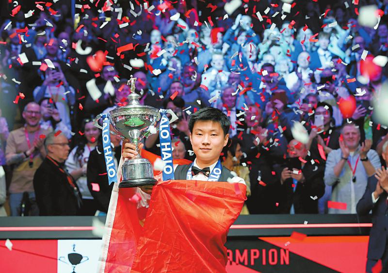中国选手赵心童5月5日顶住老将威廉姆斯最后阶段的反扑,以18∶12力克对手,成为第一位夺得斯诺克世锦赛冠军的亚洲球员。 新华社发