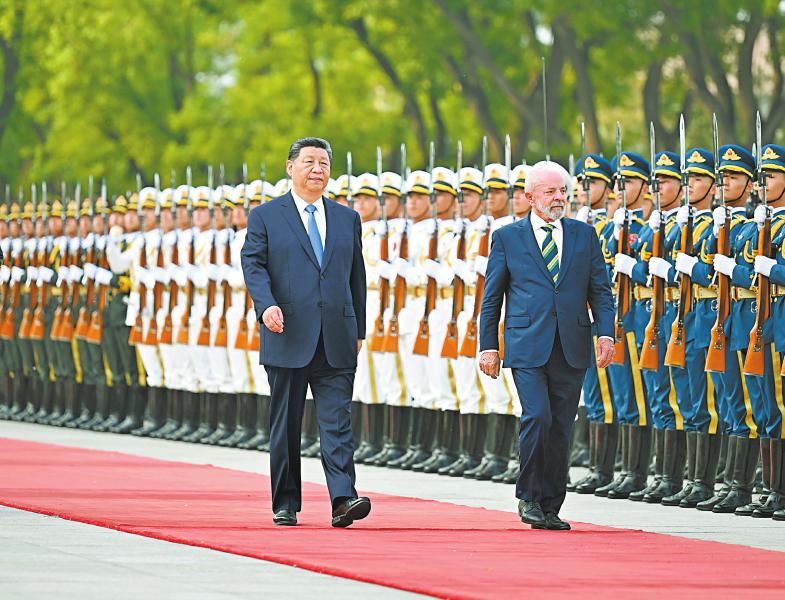 5月13日下午,国家主席习近平在北京人民大会堂同来华进行国事访问的巴西总统卢拉举行会谈。这是会谈前,习近平在人民大会堂东门外广场为卢拉举行欢迎仪式。新华社记者 燕雁 摄