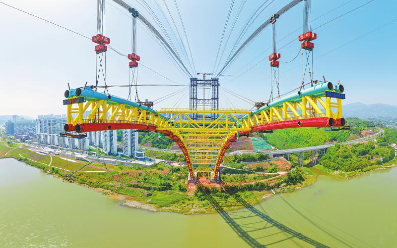 5月12日,宜宾市屏山县岷江二桥工地施工繁忙,建设者对桥梁最后几榀钢拱架进行吊装作业。岷江二桥是一座彩虹桥,预计5月16日合龙。 张元戎 摄(C视觉)