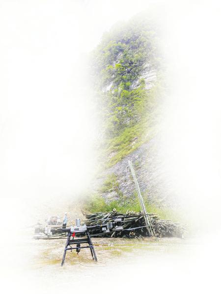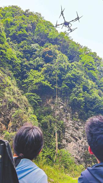 无人机正将从山顶吊运的竹子摆放整齐。四川日报全媒体记者 陈旻翔 摄
