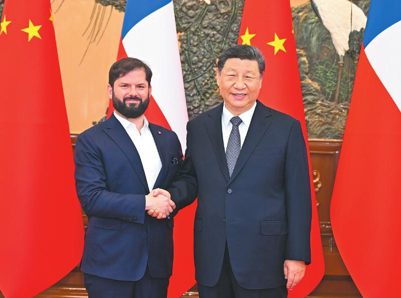 5月14日上午,国家主席习近平在北京人民大会堂会见来华出席中拉论坛第四届部长级会议的智利总统博里奇。 新华社记者 李响 摄