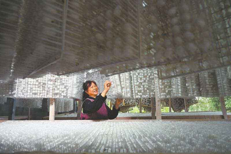 五月十六日,内江市东兴区双桥镇双流村,蚕农正在蚕房里查看蚕上蔟吐丝结茧情况。近年来,东兴区引导农民大力发展蚕桑产业,通过推广良种良法,探索每年九批次养蚕模式,进一步提高单产及蚕茧品质,促进农民增收,助力乡村振兴。兰自涛摄(C视觉)