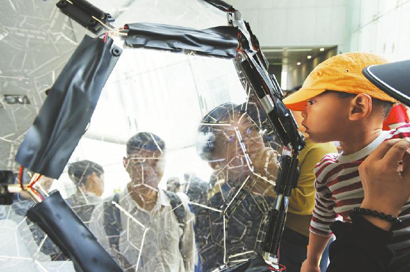 5月17日,在中国科学院数学研究所,参观者在观察阿基米德无穷宇宙展品。 新华社记者 金立旺 摄
