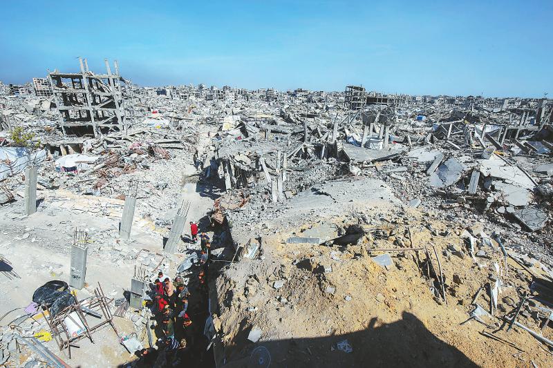 5月16日,在加沙地带北部杰巴利耶难民营,人们查看以军袭击后的建筑废墟。