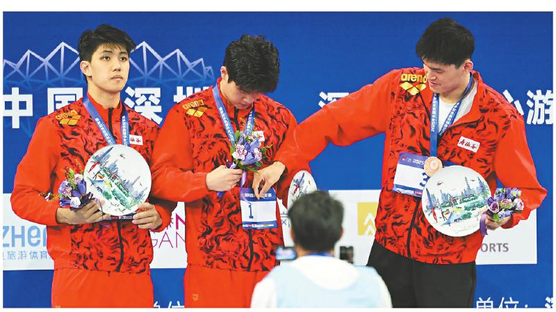 5月17日,在男子400米自由泳颁奖仪式上,孙杨(右)帮潘展乐贴好象征第一名的号码牌。 新华社记者 夏一方 摄