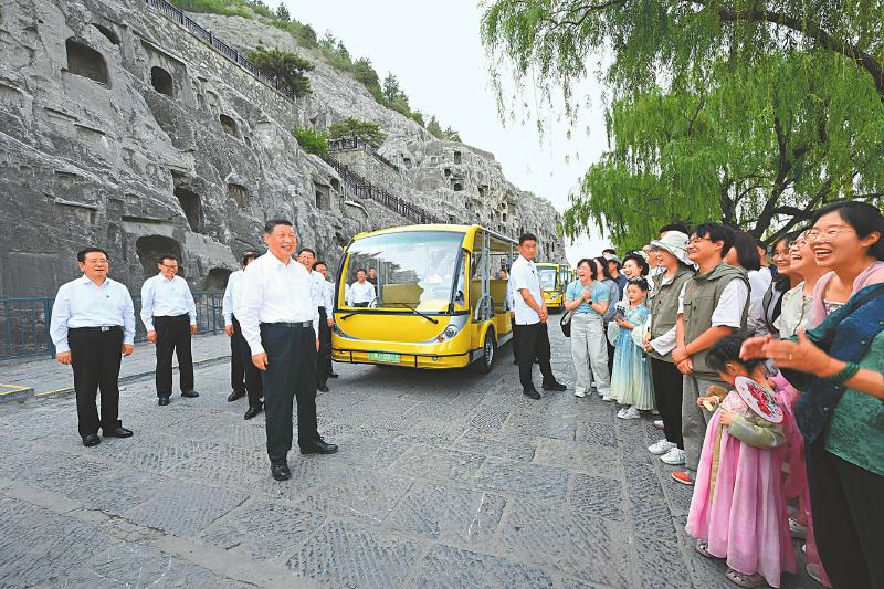 5月19日至20日,中共中央总书记、国家主席、中央军委主席习近平在河南考察。这是19日下午,习近平在洛阳龙门石窟考察时,同游客亲切交流。 新华社记者 谢环驰 摄