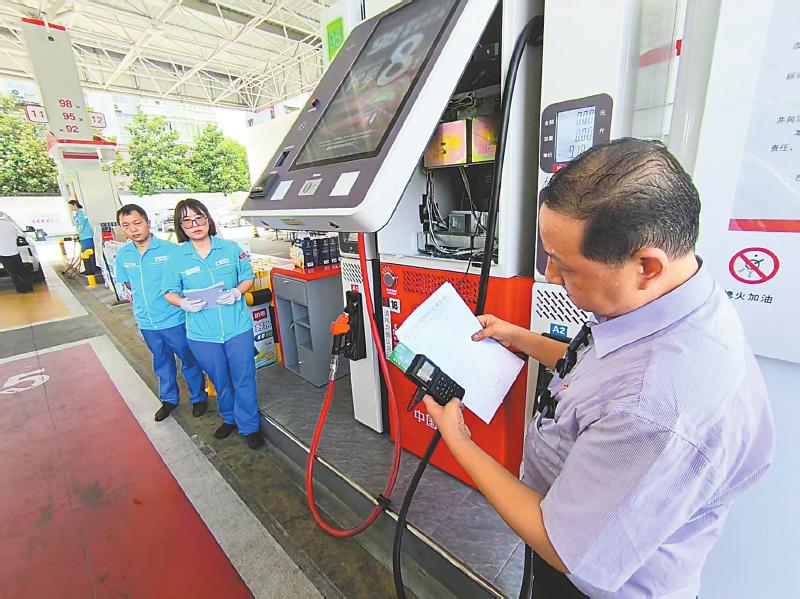 工作人员正在检查加油站设备。 新华社发(陈瑶 摄)