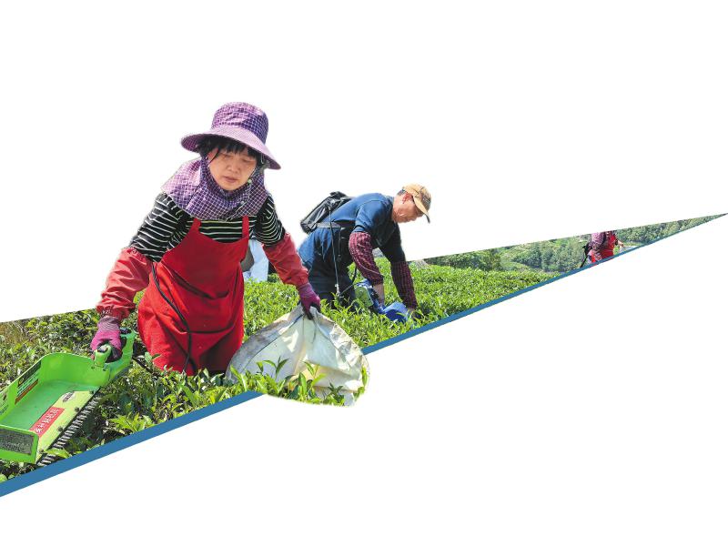 5月19日,三清庙村茶园里,村民手持采茶机在采收夏秋茶。马娟 摄