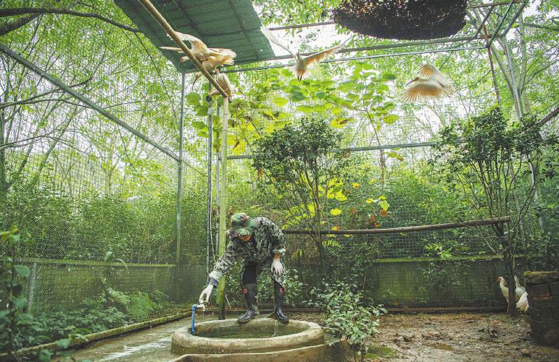 2019年10月16日,峨眉山生物资源实验站朱鹮驯养繁殖研究基地内,科研人员正在清扫朱鹮的笼舍。