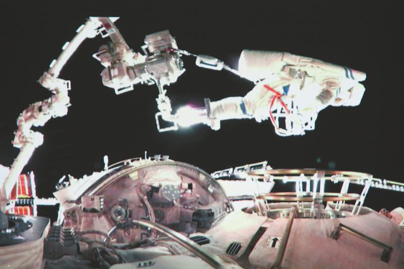 这是航天员陈冬在空间站组合体舱外工作的画面。新华社记者 厉彦辰 摄