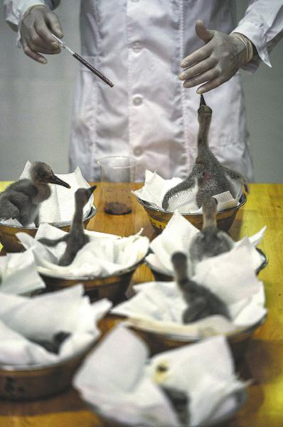 2025年5月19日,沐川朱鹮繁育中心,科研人员喂养今年出生的朱鹮。