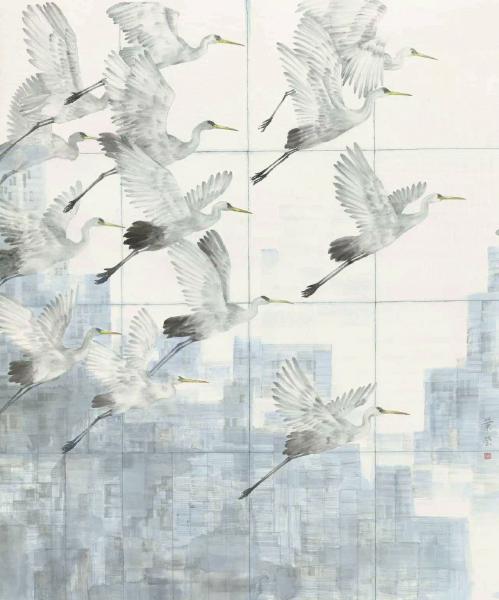 四川画家叶莹的作品,展现了一个没有烦恼纷争的艺术世界,与现实世界拉开距离。作品中,中国画的媒介和手法使其笔之所至,流淌着如水般的东方灵韵,透露着一种沉静之美。她的作品多以工笔画见长,精细描绘、层层烘染,好像在摩挲时间的肌理。在她笔下,无论草木花鸟,都不是对现实事物简单的摹写,而是在保持基本形象的基础上,注入画家的主观情思,从而成为一种具有超越性的精神意象。这幅《又见鹭影归》,以虚化的城市楼宇为背景,突出鹭群振翅奋飞、凌空而上的生动情态,氤氲的气氛、柔化的线条、淡雅的色彩,给观者以充分的遐想空间。 (余如波)