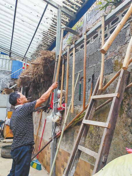 5月22日,76岁的老农陈启刚在自家后院整理锄头。