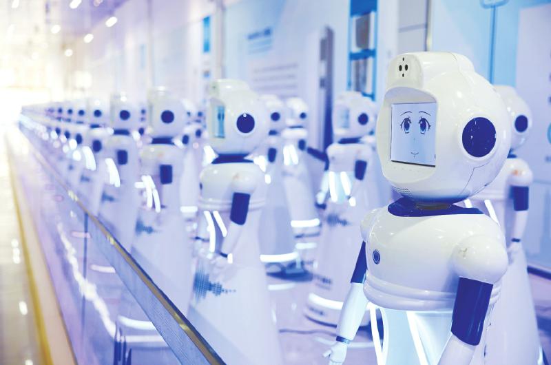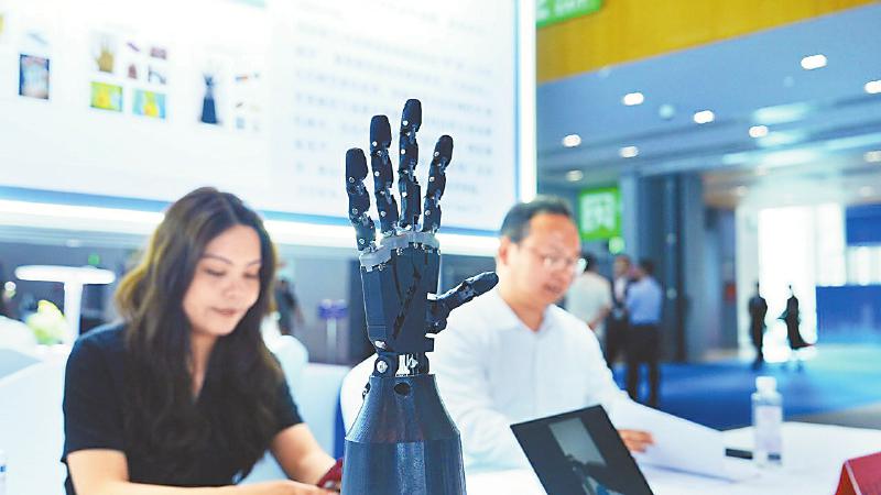 5月26日,西博会绵阳馆展出的乐聚机器人吸引外国观众握手互动。 陈冬冬 摄(C视觉)