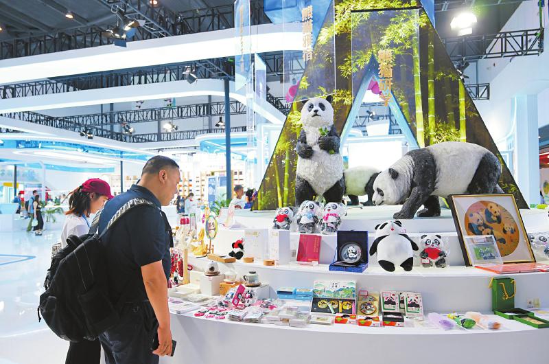 5月25日,西博会雅安馆里展示了丰富的大熊猫周边文创产品。