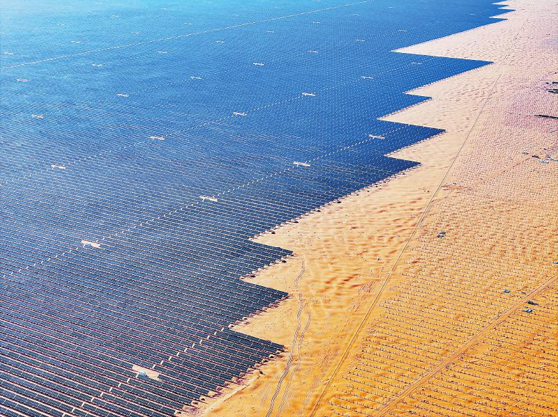 近两年来,在库布其沙漠、乌兰布和沙漠,“光伏治沙”模式被广泛运用,沙海中出现了一片片涌动着“绿能”的“蓝海”。图为6月6日拍摄的位于库布其沙漠里的鄂尔多斯市杭锦旗朔方新能源大基地(无人机照片)。 新华社记者 连振 摄