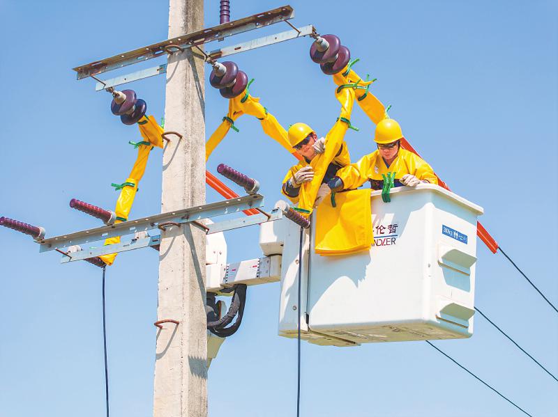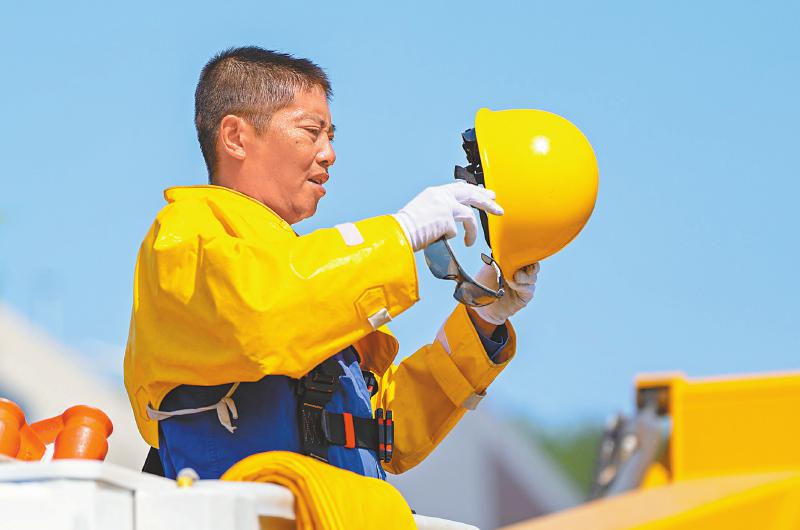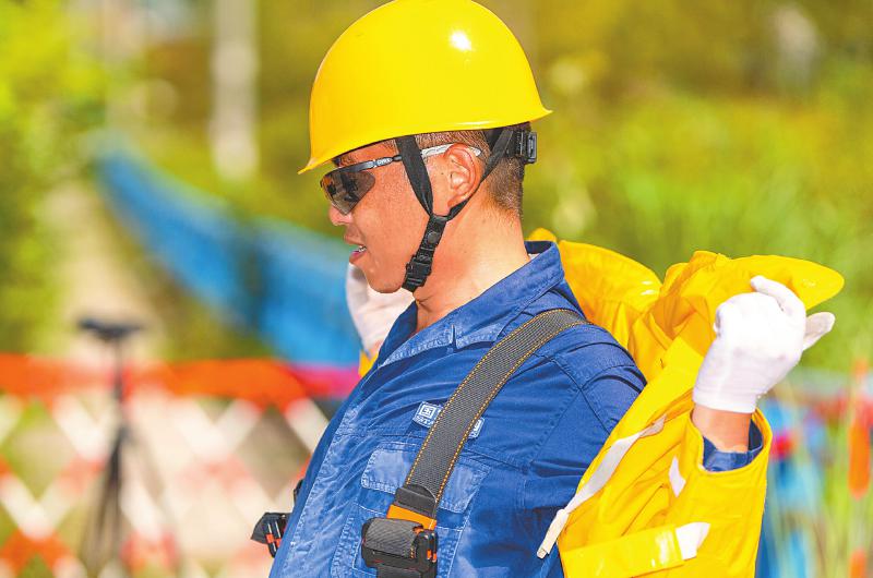 检修前,电力工人在穿戴装备时就已经满头大汗。
