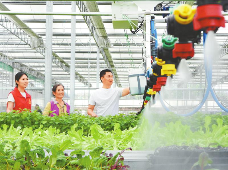 在达州市达川区双庙镇二东村“数字育苗工厂”,技术员利用智能灌溉系统进行辣椒秧苗喷淋作业。邓良奎摄(C视觉)