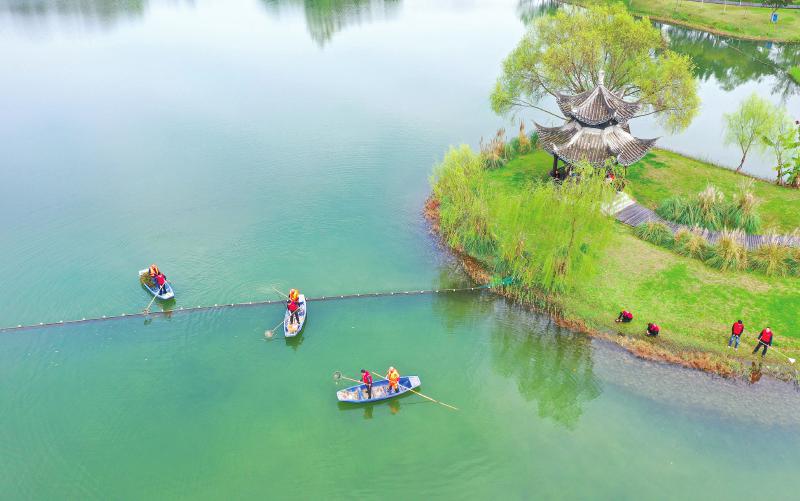 眉山市的志愿者在东坡城市湿地公园清理水面漂浮物、捡拾垃圾。姚永亮 摄(C视觉)