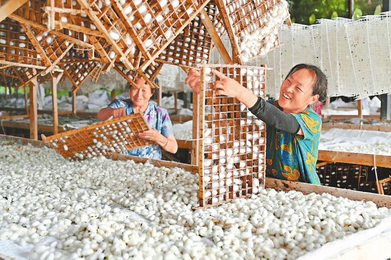 6月14日,在内江市东兴区双桥镇凤龙村,蚕农正在收获春茧。近年来,内江市东兴区因地制宜发展蚕桑产业,通过建设标准化小蚕共育室、推广旋转方格蔟具等多种手段,进一步缩短养蚕周期、提高单产及蚕茧品质,实现了由传统的春、夏、秋3批次养蚕模式变为年养蚕8—11批次的多批次养蚕模式,有效促进农民增收,助力乡村振兴。 兰自涛 摄(C视觉)