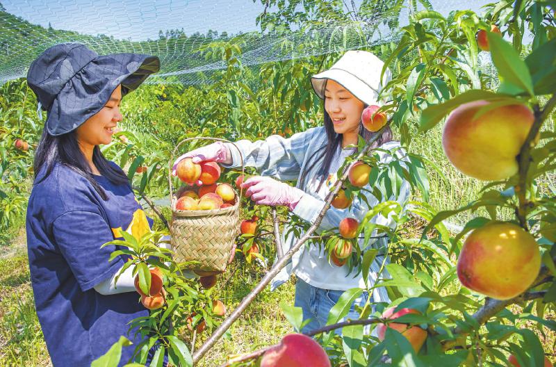 游客在广安区大龙镇建设村体验黄桃采摘。