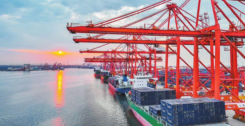 6月16日,轮船停泊在河北唐山港京唐港区集装箱码头作业(无人机照片)。 新华社发(刘满仓 摄)