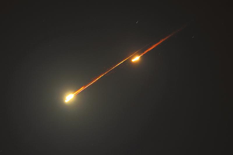 6月16日,以色列内坦亚上空的导弹飞行画面。 新华社/法新
