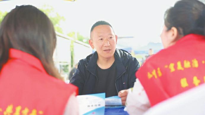居民在“宜美融治·共享方舟”巡回服务活动现场咨询政策。