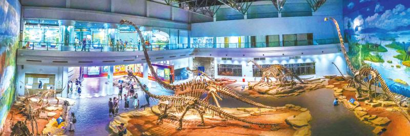 游客在自贡恐龙博物馆里参观。