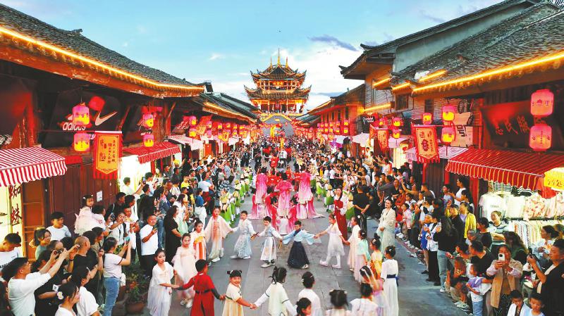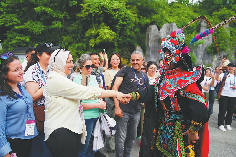 6月17日,在广安市华蓥山旅游区,演员与外籍研究人员握手问好。6月16日至19日,来自基里巴斯、柬埔寨、保加利亚、埃及等8个国家的40名文旅领域研究人员走进广安,深入了解文旅发展业态,体验中国传统文化魅力。范聪 摄(C视觉)