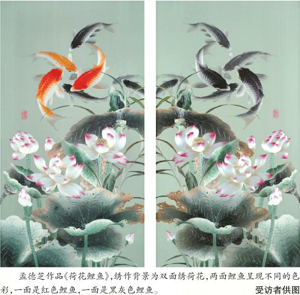 孟德芝 1961年3月生,四川成都人。第五批国家级非物质文化遗产项目蜀绣代表性传承人,中国工艺美术大师。出身于蜀绣世家,坚持学习钻研蜀绣40多年,熟练掌握蜀绣技艺和全部针法,尤其擅长双面异色绣和双面异形绣。代表作有《蜀宫乐伎》《芙蓉鲤鱼》《文君听琴》《九子·熊猫图》《秋色高原》等。在多地建立蜀绣技工培训基地,培养上百名蜀绣手艺人。