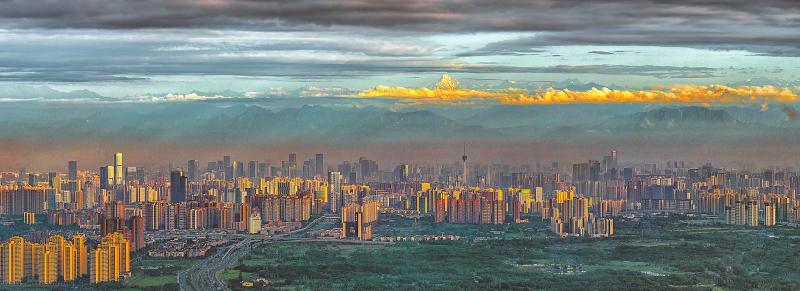 6月30日,雨后的成都再现幺妹峰“日照金山”美景。嘉楠 摄(C视觉)