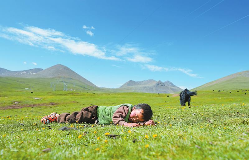 尼美多吉的小儿子尼美索郎在草地上玩耍。 新华社记者 王曦 摄