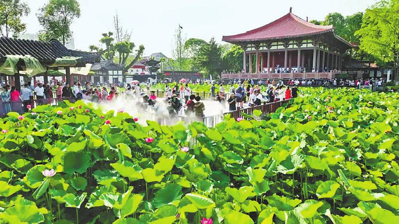 近日,望丛祠内荷花绽放,吸引游客前往欣赏。 郫都区融媒体中心供图