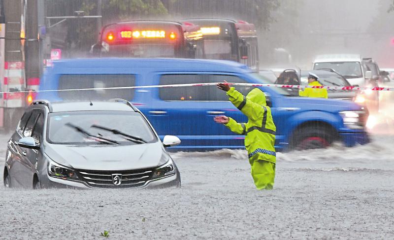 7月3日下午,暴雨导致成都蜀都大道东风大桥至水碾河、水碾河至双桥子路段双向主干道出现积水。交警在水中疏导交通。 四川日报全媒体记者 华小峰 摄