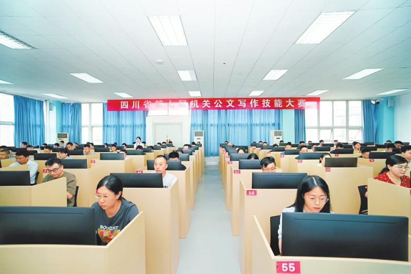 四川省机关公文写作技能大赛现场,参赛选手们正在认真答题。