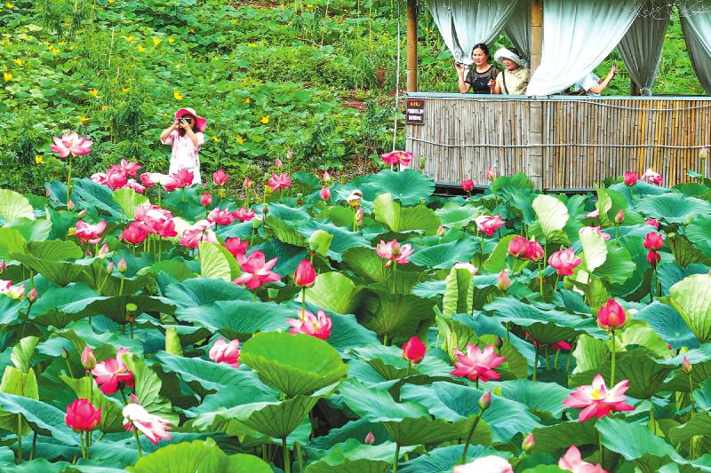 盛夏时节,雅安市雨城区西城街道青元村的荷塘小院内开满了粉嫩的荷花。6月30日,市民在清晨的凉爽时光里,记录诗情画意的荷塘美景。雅安观察 黄刚 摄