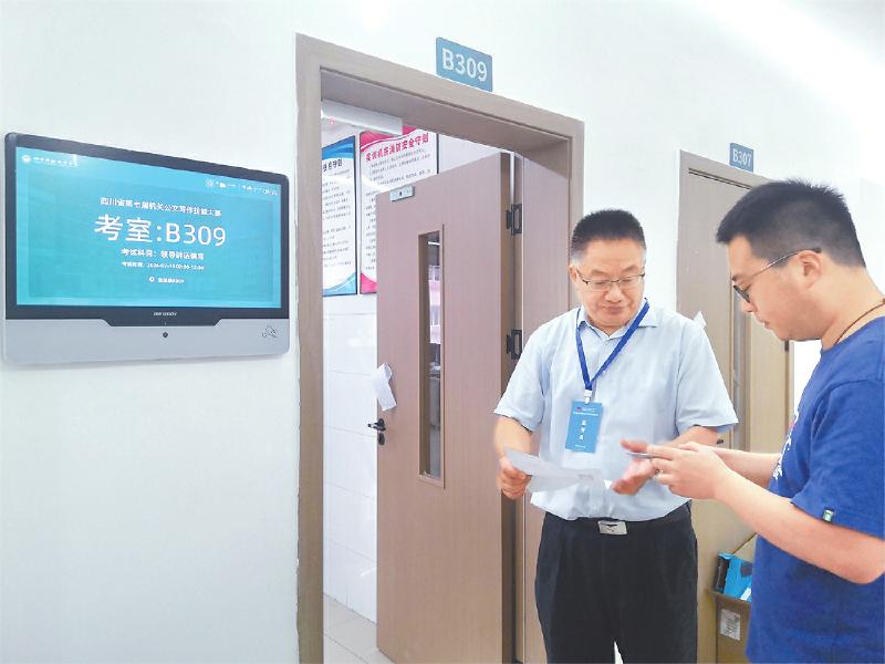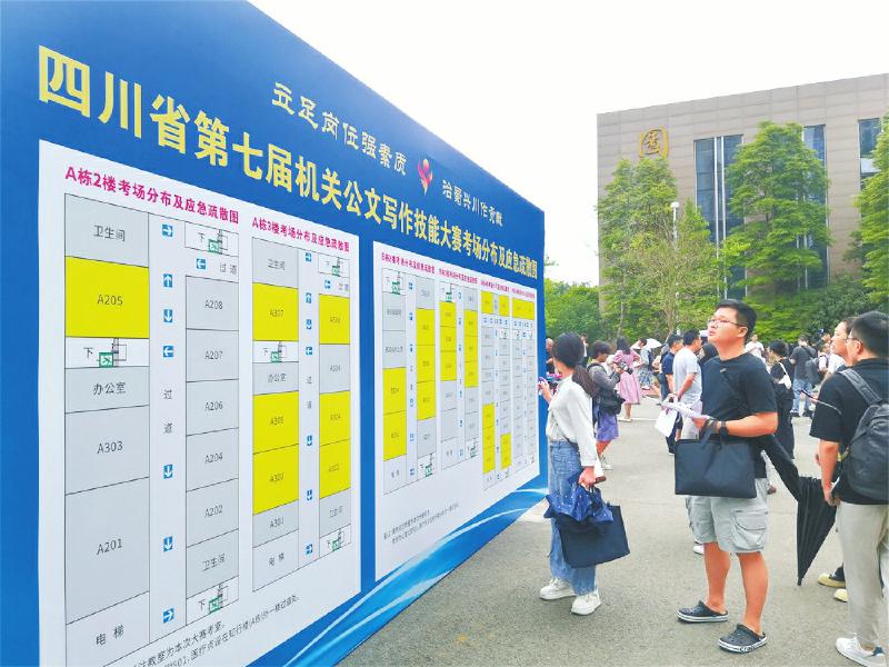 参加四川省第七届机关公文写作技能大赛的选手们正在查看考场分布图。