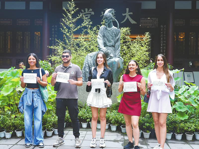 5名希腊网络达人在杜甫草堂展示诗词文创。 周宝 摄