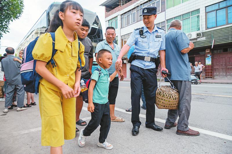 7月3日早晨,广安市前锋区广兴镇,民警护送孩子们上车前往东莞。