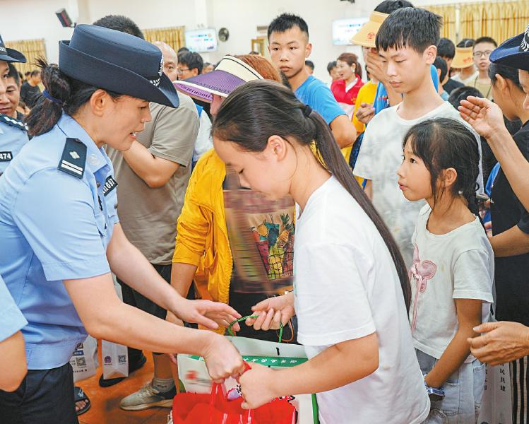 7月4日,广东省东莞市大朗镇,大朗派出所民警给孩子们发放暑期大礼包。