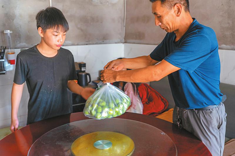 出发前,爷爷把家里收获的李子交给李涛(左),带给在东莞打工的父母尝尝家乡的味道。