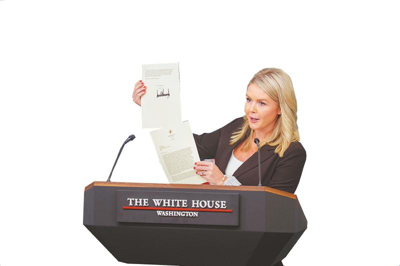 7月7日,白宫新闻发言人卡罗琳·莱维特在记者会上展示特朗普致韩国总统的信函。 新华社记者 胡友松 摄
