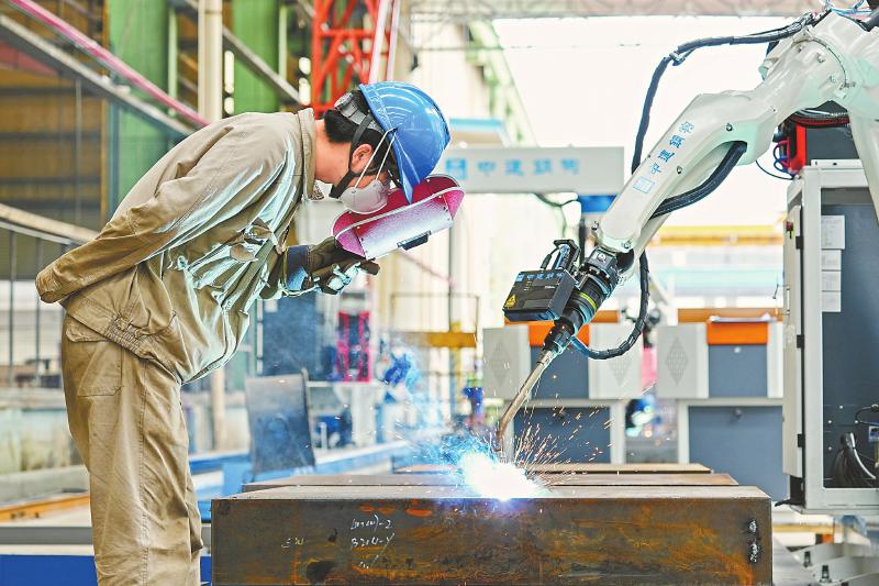 7月8日,眉山天府新区视高街道中建钢构四川有限公司加工车间内,工人正配合机器人焊接赶制钢构产品。近年来,眉山天府新区坚持工业强区战略,以数字化转型为引领,扶持企业革新生产技术、升级生产设备,培育智能科技型专精特新企业,推动制造业向高端化、智能化、绿色化、融合化发展。翁光建 摄(C视觉)