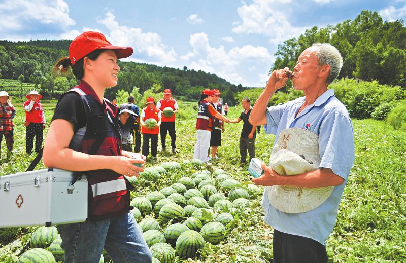 7月9日,在绵阳市梓潼县双板镇德胜村,村民服用免费发放的藿香正气水。连日来,梓潼县双板镇卫生院组织党员志愿者、家庭医生团队下村深入田间地头,为高温下采摘西瓜的村民免费发放防暑祛暑药品,并讲解室外劳作防暑降温的知识。 成和平 摄(C视觉)