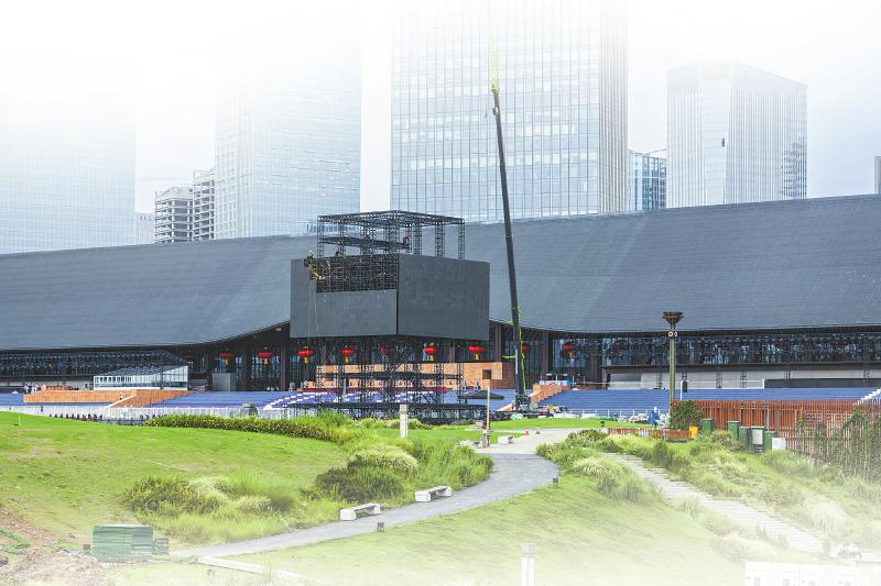 7月9日,成都西博城秦皇湖边,第12届世界运动会开幕式主场地“天府之檐”,巨大的电子屏安装工作和场地绿化美化等工程有条不紊地进行。 杨容生 摄(C视觉)