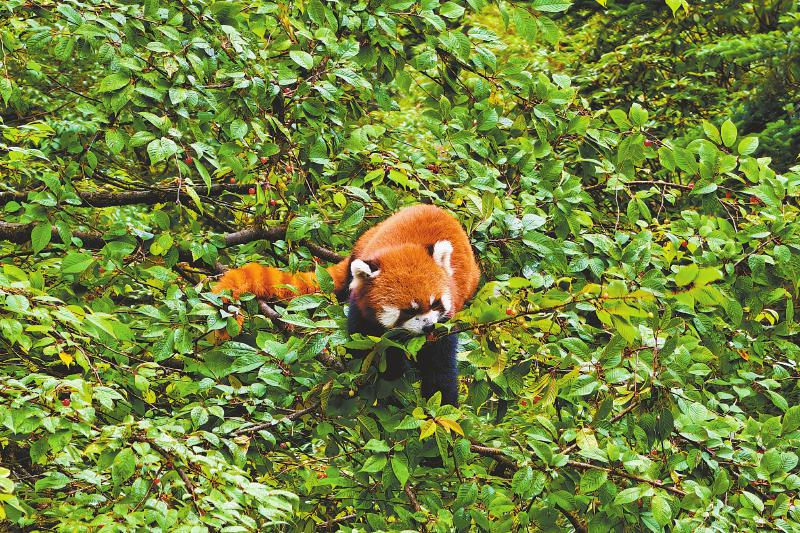 瓦屋山景区的野生小熊猫正在享用野樱桃。 汪芋媚 摄