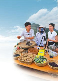 苍溪县河地镇兴华村党支部书记谢艾军(左一)正在直播销售村民自家农产品。四川日报全媒体记者 黄潇 摄
