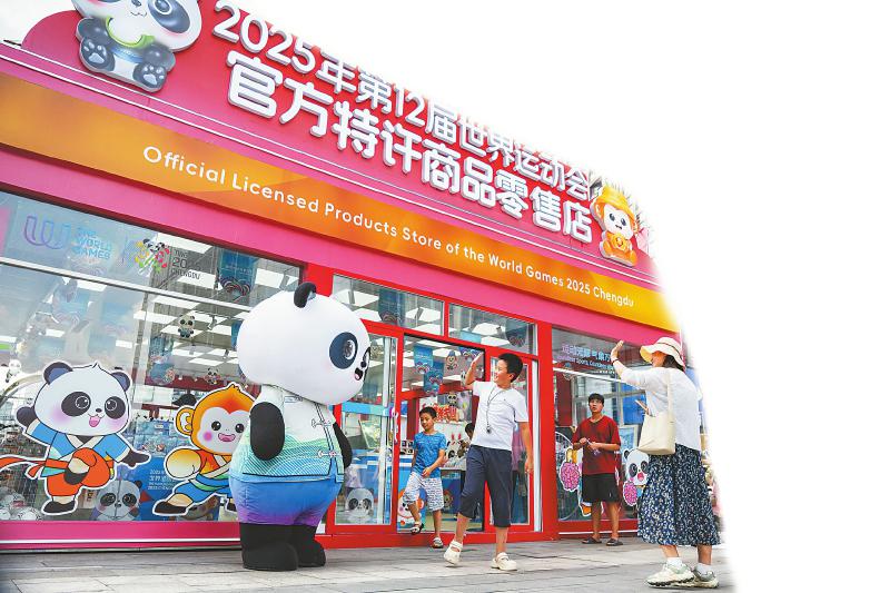7月14日,游客在世运会官方特许商品零售店红星路店门口和“蜀宝”打招呼。