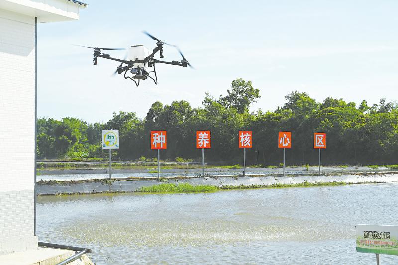 无人机在养殖基地上空投喂稻虾。 李腾 摄